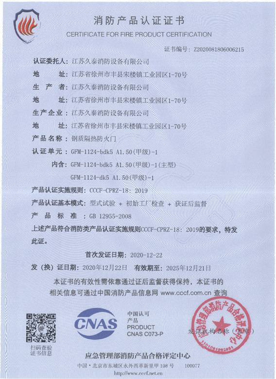 甲级-1钢质隔热防火门消防产品认证证书