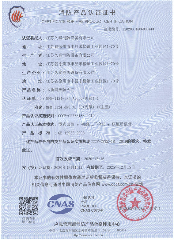 丙级-1木质隔热防火门消防产品认证证书
